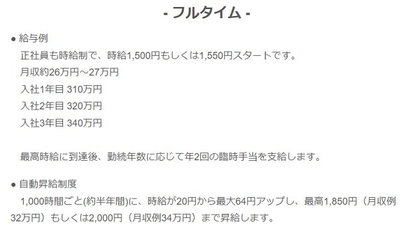 コストコの求人によると、フルタイムの正社員とパートタイマーで両者ともに時給制であり、最低時給はいずれも1500円である。全店舗一律であるため、店舗ごとの初期時給に差はない。