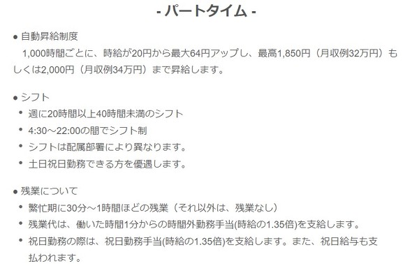 その他、1000時間ごとに時給が20〜64円アップする自動昇給制度を採っており、フルタイム・パートタイム問わず時給は最高で1850円または2000円まで上昇する仕組みだ。コストコ本体ではないが、店舗内で試食や商品PRなどの業務を担うクラブ・デモンストレーション・サービシズ社の採用情報を見ても時給1300〜1400円以上の募集が多く、一般的に見て高い水準となっている。