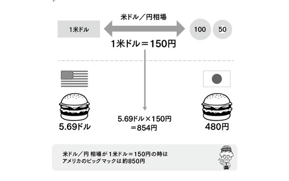 英国のエコノミスト誌が世界のビッグマックの価格を調べていて、米国のビッグマックの価格は平均すると5.69米ドルだそうだ(2024年7月公表のデータ)。今、円を米ドルに交換しようとすると、1米ドルを受け取るのに150円必要になる。簡単な掛け算をすると、先にも触れたように、150円(米ドルと円の交換レート)×5.69米ドル(米国のビッグマックの値段)=約850円になる。