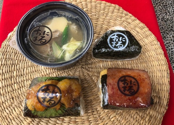 おにぎりは硬くならないよう焦げ目までは付けず、しょうゆダレの香ばしさを出すために炙っており、種類は常時20以上ある。看板メニューは、3尾の海老天が乗ったぜいたくな「香味だれ海老天むす」や、スパムおにぎりを独自にアレンジしたような「炙りポーク玉子」だ。