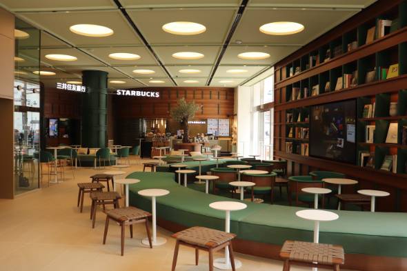 2024年5月にオープンした1号店の「オリーブ ラウンジ 渋谷店」は、1階に銀行とスターバックス、2階にカルチュア・コンビニエンス・クラブ社(以下、CCC社)が運営するコワーキングスペース「SHARE LOUNGE(シェアラウンジ)」を備え、地下1階にはオリーブのアカウント契約者が使える個室やソファもある。