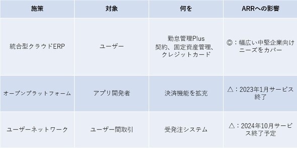 新戦略では「統合型クラウドERP(※1)を提供し、人事や会計など異なる業務間でもデータを緊密に連携させることでリアルタイムの分析を可能にし、経営者の意思決定に役立てられる」という点を訴求した。勤怠管理や固定資産管理、電子契約、法人クレジットカードといった中堅企業向けプロダクトを拡充販売し、コアとなる人事労務や会計の導入につなげる施策をとった。