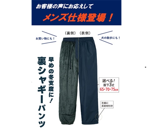 これまではレディース用のみの取り扱いだったが、「メンズ用も作ってほしい」という声を受け、今回のメンズ版の発売に至った。男性からの要望が多い「前開き」を取り入れ、ゴム&スピンドル仕様で脱ぎ着しやすく、暖かい履き心地に仕上げた。ポケットも豊富で、左右ポケット・右後ろポケットを付けた。