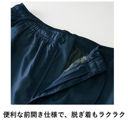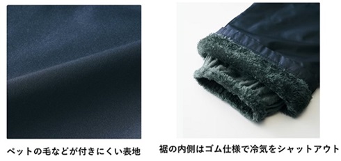 表地は風を通しにくいタフタ素材で、裾の内側はゴム仕様で冷気をシャットアウトする。ペットの毛が付きにくいため犬との散歩などの場面にも使いやすく、左裾に反射材が付いているので薄暗い朝夕でも出かけやすい。またゆったりとしたシルエットで動きやすいため、スポーツ観戦などのアクティブな場面でも履きやすい仕様だ。