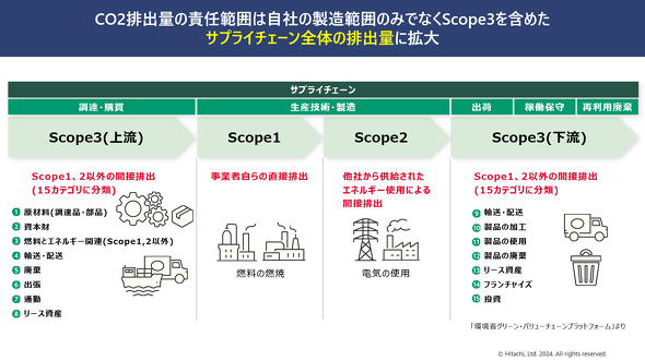 では「サプライチェーン全体のCO2排出量の把握」において、具体的に何が求められるのか。従来、把握の責任範囲は「自社が直接排出したCO2」(=Scope1)と「他社から供給されたエネルギー使用で間接排出したCO2」(=Scope2)だった。しかしこの先は、調達や購買といった「上流」と、出荷や破棄といった「下流」での間接排出(=Scope3)を含めた把握が求められるようになる。