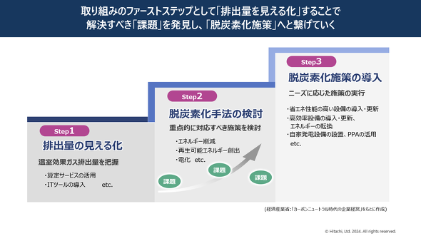 では、これにどう対応すればよいのか。日立は社会インフラを支えるグローバル企業としてGXに長年取り組んできた。そこで蓄積したノウハウと推進手段を顧客企業に還元しているという。そのロードマップが以下の「カーボンニュートラル実現に向けた3つのステップ」だ。