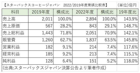 スターバックス コーヒー ジャパンの業績をコロナ前と比較すると、2022年度は2019年度に比べて売上高は143.9%。純利益率も5%を超えており、飲食業の中でも高収益体質を維持している会社といえます。
