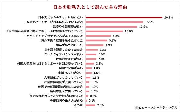 外国人材が日本を勤務先として選んだ理由1位は「日本文化やカルチャーに触れたい」だった。教育事業などを展開するヒューマンホールディングス(東京都新宿区)が、外国籍の309人を対象に実施した「日本での仕事観とキャリアに関する実態調査」で分かった。2位は「家族やパートナーが日本に住んでいるため」(15.5%)、3位は「治安や生活環境が良い」(13.9%)となり、生活する上での希望を重視している様子が見られた。