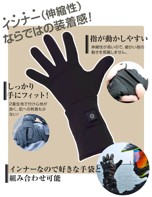 インナーヒーターグローブは、普段使いする手袋の中に着用できるように設計しており、伸縮性の高い薄手の生地を採用する。