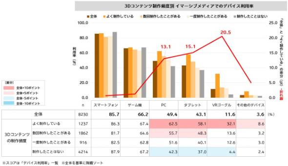 イマーシブメディアサービスを利用する際のデバイスについて尋ねた。3Dコンテンツを「よく制作している」と答えた人をみると、全体よりもPC(62.5%)、タブレット(58.1%)、VRゴーグル(32.1%)の利用率が高かった。