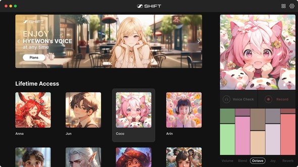 例えば、筆者がShiftを使用する前に10秒ほど声をインプットすると、声の低音が分析されて変換される声がより自然なものになる。Shiftは女性、高齢者、子ども、アニメチックなど38種類のキャラクターを用意していて(2024年11月5日時点)、任意に選んだ声に変換可能だ。
