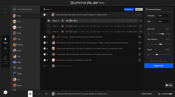 後者のPlayは、打ち込んだテキスト文章を、選択したキャラクターの声で読み上げることができる。Shiftと同様、音声の高さや抑揚などを調整できる上、英語や日本語など複数の言語で生成できるという。