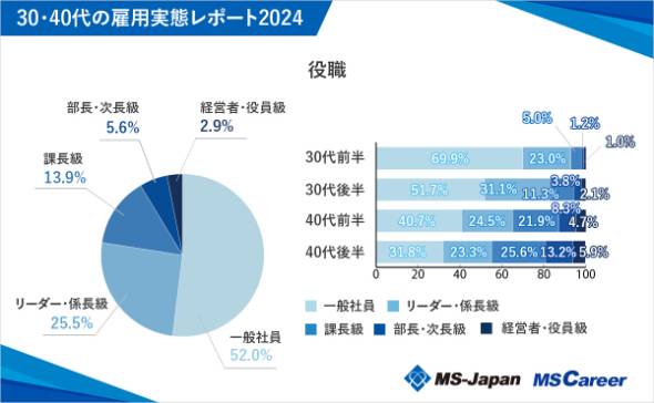 役職については、30代前半では7割が一般社員だった。一方で、30代後半になると一般社員と役職付きが約半々となった。40代前半では一般社員が4割まで減っていた。