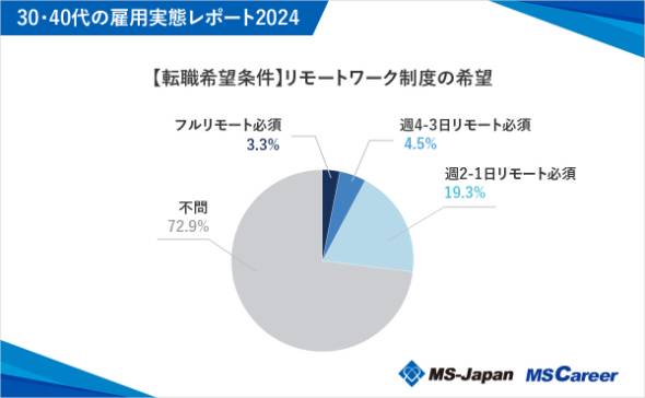 転職時のリモートワーク希望状況については、72.9%が「リモートワークは不問」と回答した。3.3%が「リモートワークを必須条件」、4.5%が「週4、3日リモート必須」、19.3%が「週2、1日リモート必須」と回答し、約3人に1人が転職時にリモートワークを求めていることが分かった。