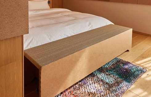 良品計画は今回のプロジェクトで紙のリサイクル性、耐久性、軽さに着目し、建材や家具の素材に使用。ノートの端材を使用した壁面ボードや、強化ダンボールのみを使用して作ったベンチなどを部屋に取り入れた。