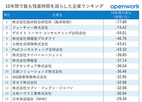 1位の船井総研と2位のフューチャーに投稿された残業時間を見ると、2015年はどちらも月100時間を超えていたが、この10年で70時間以上も減ったことになる。多くの声を分析すると「企業として長時間労働の是正に取り組んでいることや、個人の裁量によって調整可能であることがうかがえた」(オープンワーク)という。