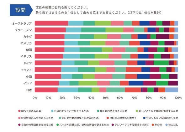 求職者が転職において重視する要素の一つに、「給与」があります。リクルートとIndeedの研究機関「Indeed Hiring Lab」が2023年、日本を含む世界11カ国のフルタイム勤務者、かつ直近に転職を経験した人を対象に行った調査では、「転職の目的」の問いに対し、いずれの国でも「給与を高めるため」という回答が最多でした。