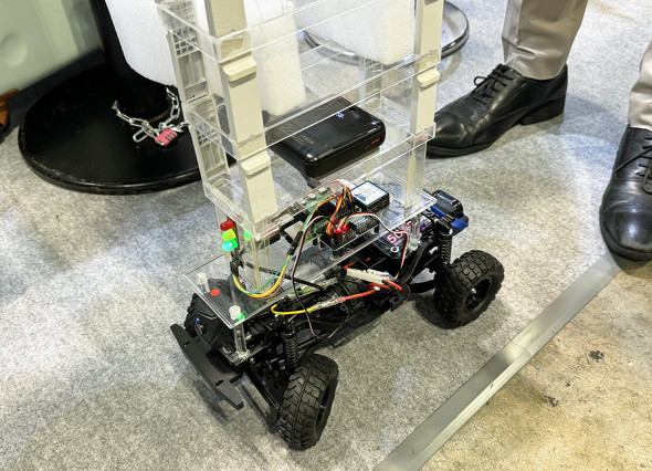 船舶の揺れを研究している東京海洋大学の渡邉豊教授は、揺れと重心の連携からヒントを得て三次元重心検知理論を考案した。これはあらゆる乗り物に適用できるものとして、トラックの横転限界を検知するシステムを開発し、今回、模型をブース展示していた。