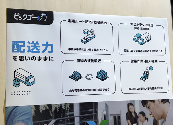 そして、物流の2024年問題が徐々に表面化している中、物流関係のスタートアップ企業の出展もあった。軽貨物などの小規模なトラック事業者(個人事業主も含む)と荷主をマッチングさせるチャーター便のサービス「ピックゴー」を運営するCBcloud(東京都千代田区)は、宅配企業のエコ配と合同でブースを展開していた。