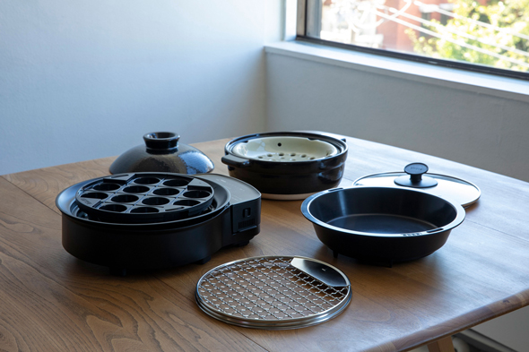 おうちいろりの特徴は、付属のプレートを使い分けることでさまざまな料理を楽しめるようにしたこと。焼き鳥などの串料理や炙り焼きが楽しめる焼き網、炒め料理や煮込み料理にも使える深皿、たこ焼きなどがつくれるボールプレート、高い蓄熱性と保温効果を備えた土鍋などがある。