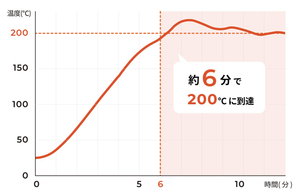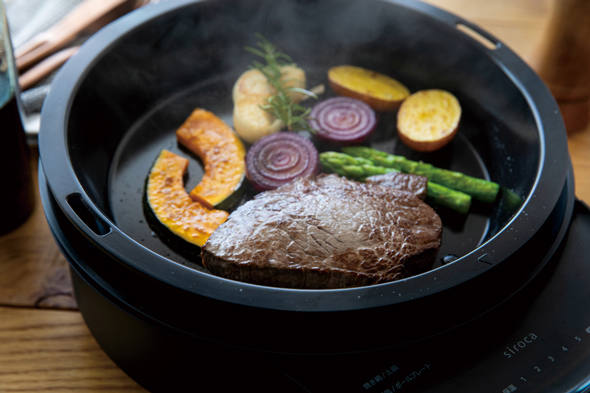 高火力のヒーターですばやくプレートをあたため、安定した温度による調理を可能とした。深皿を使用した際、200度に到達するまでの時間は約6分。鋳物のプレートは蓄熱性が高く食材を乗せても表面温度が下がりにくいため、食材をムラなく仕上げられる。温度は料理に合わせて、5段階で設定可能だ。