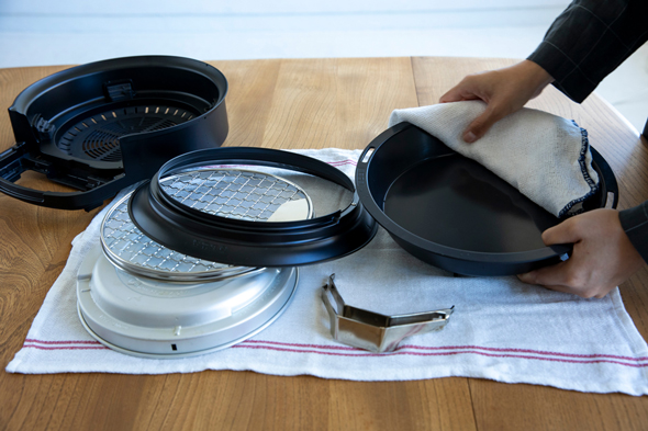 調理家電はどうしても「お手入れが大変」「収納場所に困る」といった理由で使用頻度が下がる印象もあるが、おうちいろりについては「いかに日常使いしてもらえるか」にもこだわっている。減煙構造のほか、清掃のしやすさ、一般的なホットプレートと比較してかさばらないような収納性も意識した。