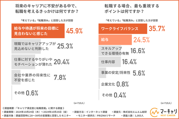エムエム総研は調査結果を踏まえ、「6割以上が数社にわたってキャリアを積み上げているものの、身に付けたスキルが今後役立つのか、やりがいや情熱を感じない、今の仕事を長期的に続けられるかといった不安を感じている。キャリアを磨くには、自分に合った成長環境を見つけることが大切。現職は自分に合っているのか、理想の待遇からどれだけ近いのか、あらためて考える必要があるのではないか」とコメントしている。