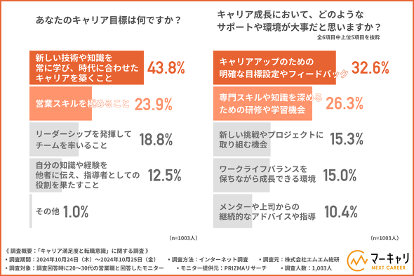 キャリアに不安を抱えている営業職が多いことが分かったが、彼らはキャリア成長のためにどのようなサポートや環境を求めているのか? 調査によると、最も多く寄せられた回答は「キャリアアップのための明確な目標設定やフィードバック」(32.6%)だった。