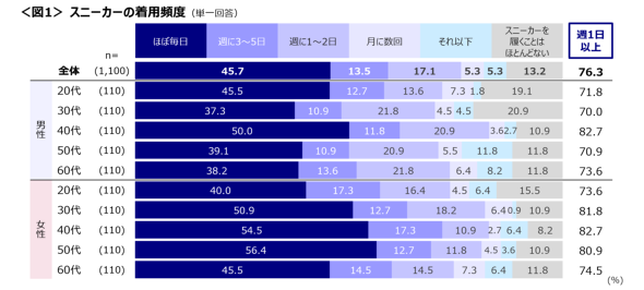 スニーカーを「ほぼ毎日履いている」と回答したのは45.7%。男性より女性の方が高頻度で履いている傾向が見られ、特に女性30〜50代で「ほぼ毎日履いている」は5割を超えた。一方で、男性の20〜30代は「ほとんど履かない」が2割前後に上った。