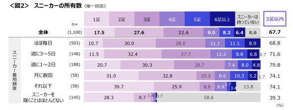 スニーカーの所有数は「2足」が最も高く27.6%。「3足以内」は67.7%だった。「ほぼ毎日スニーカーを履く」と回答した人でも、所有数は「3足以内」が68.8%となり、必要最低限しか所有していない傾向が見られた。
