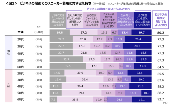 一方で、男性50〜60代は「ビジネスではスニーカーは避けたほうがよいと思う」とした人が3割を超え、他年代と比べて拒否感が強い傾向となった。男性20〜30代では「全く問題ないと思う、自由な服装をすべきだと思う」とした人が約3割を占める一方、「ビジネスではスニーカーは避けたほうがよい」とした人も約2割に達し、意見が分かれた。