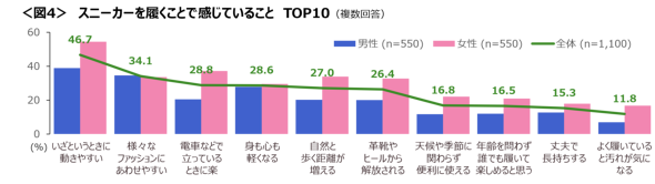 スニーカーを履くことで感じていることについては、「いざというときに動きやすい」が最も多く46.7%。次いで、「様々なファッションにあわせやすい」(34.1%)、「電車などで立っているときに楽」(28.8%)と続いた。