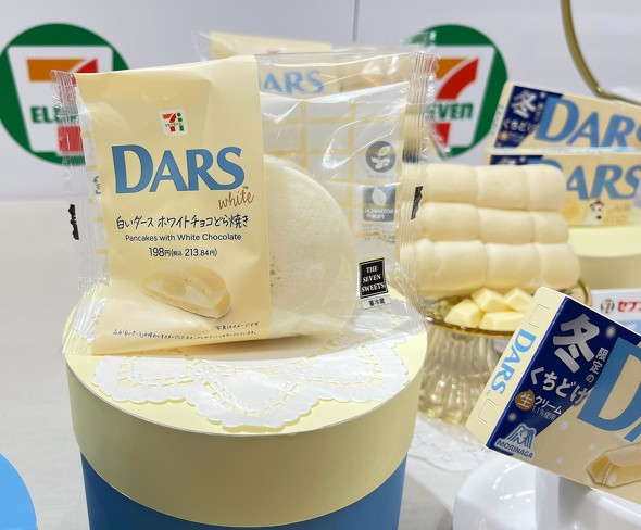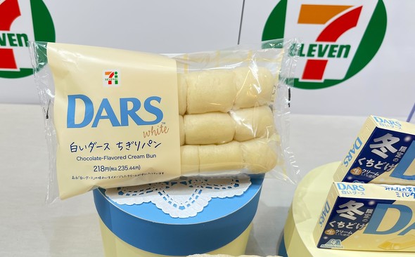 森永製菓とのコラボ商品は、「白いダース ホワイトチョコどら焼き」(198円)と「白いダース ちぎりパン」(218円)の2商品。ホワイトチョコどら焼きはもちもち食感の白いどら焼き生地で、ホワイトチョコホイップのガナッシュをサンドした。隠し味としてキャラメルペーストを加えている。ちぎりパンには、濃厚なミルク感のあるホワイトチョコレートクリームを挟んだ。