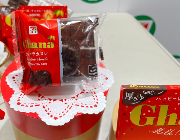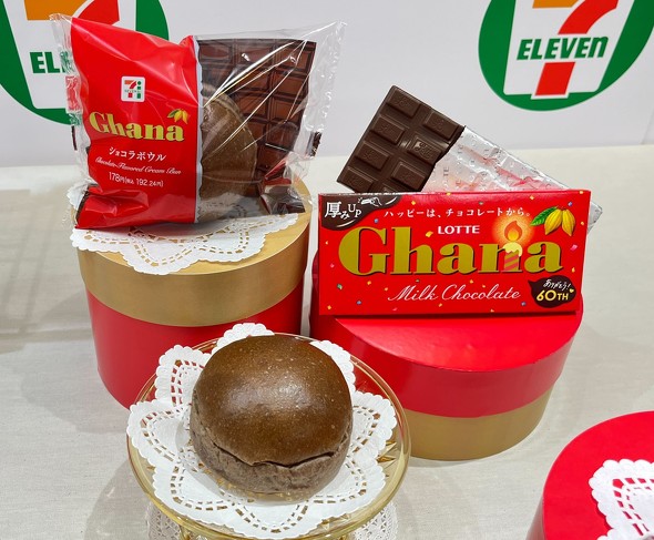 ロッテとのコラボ商品は「ガーナ ショコラカヌレ」(248円)、「ガーナ ショコラボウル」(178円)。ショコラカヌレは生地全体にチョコレートを配合し、どこを食べてもガーナの味わいを感じられるようにした。また、生地のもちもちした弾力感をあえて抑え、外側との食感の対比を強調した。ショコラボウルは、ガーナミルクをクリームに使用したパンで、クリームはガーナミルクの濃厚でコクのあるミルクの味わいを再現した。