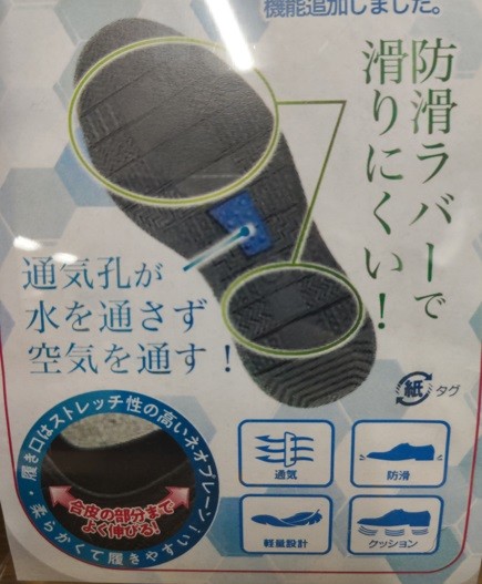 改良版では靴底に通気孔を取り付けることで、蒸れにくくした。水を通さず空気を通す仕様になっているという。また、滑りにくくするために、靴底に防滑ラバーを新たに貼りつけた。価格は5499円としている。