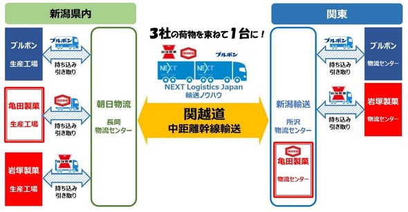 今回の取り組みは、日野自動車が設立したNEXT Logistics Japanの提案に、亀田製菓、ブルボン、岩塚製菓の3社が賛同し実現した。輸送面では朝日物流と新潟輸送が協力する。