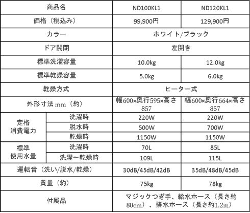 本体サイズは、洗濯容量10キロ/乾燥容量5キロのND100KL1が600(幅)×857(高さ)×595(奥行き)ミリ、同12キロ/6キロのND120KL1が600(幅)×857(高さ)×664(奥行き)ミリ。ND100KL1は同社の10キロ縦型全自動洗濯機「NT100J1」よりも体積が小さく、設置場所や搬入経路が限定される集合住宅にも置きやすいとしている。
