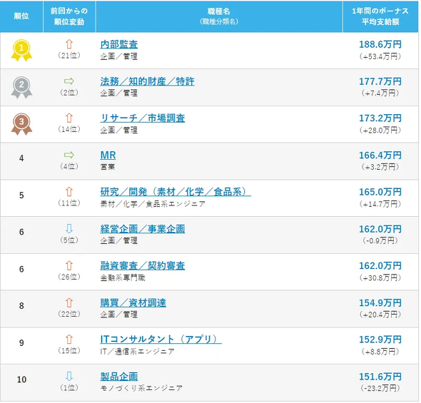 職種別では内部監査職が188.6万円で1位となり、前回21位から順位を上げ、支給額は53.4万円増加した。2位は法務・知的財産・特許職(177.7万円)、3位はリサーチ・市場調査職(173.2万円)で、上位3位を「企画・管理」系職種が占めた。
