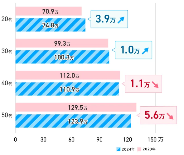 年代別では、20代と30代で支給額が増加し、40代と50代では減少した。20代は3.9万円増の74.8万円、50代は5.6万円減の123.9万円となった。年間100万円を超える支給額の割合は全体で48.5%(前回比0.4ポイント増)で、50代が54.9%と最も多く、40代が50.0%、30代が47.7%と続いた。