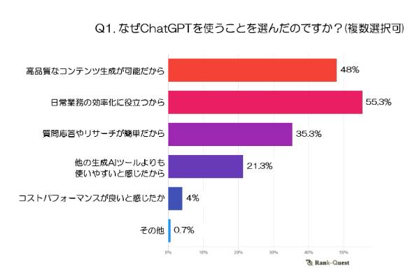 AIツールの利用が拡大する中で、なぜChatGPTを選んだのか。最も多かった理由は「日常業務の効率化に役立つから」(55.3%)だった。「高品質なコンテンツ生成が可能だから」(48%)、「質問応答やリサーチが簡単だから」(35.3%)が続く結果に。一方「他の生成AIツールよりも使いやすいと感じたから」(21.3%)や「コストパフォーマンスが良いと感じたから」(4%)は、低い割合にとどまっている。