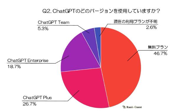 ChatGPTのプラン利用状況については「無料プラン」(46.7%)が最も多かった。「ChatGPT Plus」(26.7%)、「ChatGPT Enterprise」(18.7%)が続く。多くのユーザーが無料プランを利用している一方で、有料プランであるPlusやEnterpriseも一定の支持を得ていた。