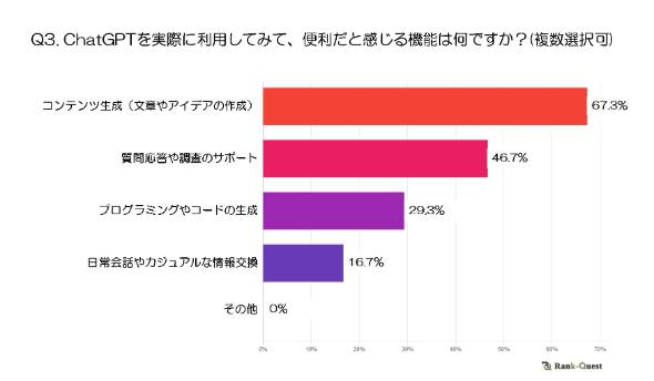 ChatGPTの便利だと感じる機能1位は「コンテンツ生成(文章やアイデアの作成)」(67.3%)。一方「プログラミングやコードの生成」(29.3%)や「日常会話やカジュアルな情報交換」(16.7%)といったニッチな用途では、便利と感じる割合が低い結果となった。