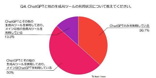 ChatGPTの利用状況については「ChatGPTとその他の生成AIツールを併用しており、メインはChatGPTを利用している」が全体の半数を占めた。「ChatGPTのみを利用している」(36.7%)が続いていて、ChatGPTは多くのユーザーにとってメインツールとして選ばれているようだ。