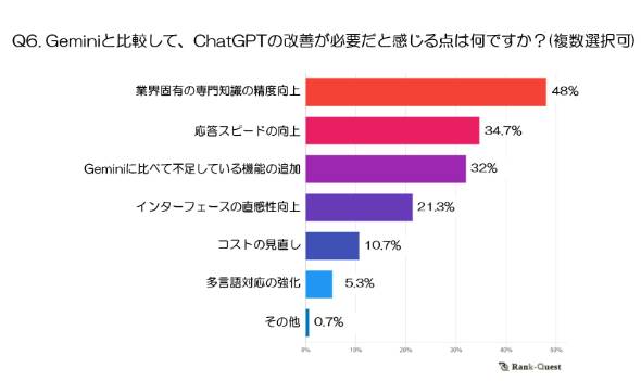Geminiと比較してChatGPTで改善が必要だと感じる点は何か? SEOコンサルティングなどを手掛けるeclore(東京都新宿区)が運営するSEO支援サービス「ランクエスト」の調査によると、最も多かったのは「業界固有の専門知識の精度向上」(48%)だった。2位は「応答スピードの向上」(34.7%)、3位は「Geminiに比べて不足している機能の追加」(32%)という結果に。一方「コストの見直し」は10.7%、「多言語対応の強化」は5.3%となり、大きな不満が少ないことが示された。