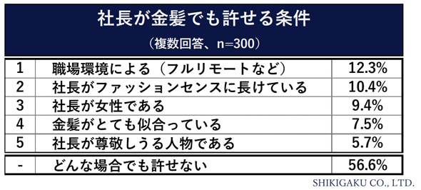 一方、社長の金髪を「許せない」答えた人は、どのような条件であれば許せるのか。この質問に対し、「職場環境による(フルリモートなど)」(12.3%)、「社長がファッションセンスに長けている」(10.4%)などが上位に。