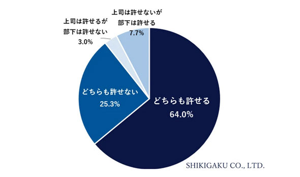 部下や上司が金髪だった場合、どのように受け止めている人が多いのだろうか。「どちらも許せる」は64.0%、「どちらも許せない」は25.3%。では、上司と部下でどちらの金髪が許せるかという質問には「上司は許せる」(3.0%)、「部下は許せる」(7.7%)とわずかな差となった。