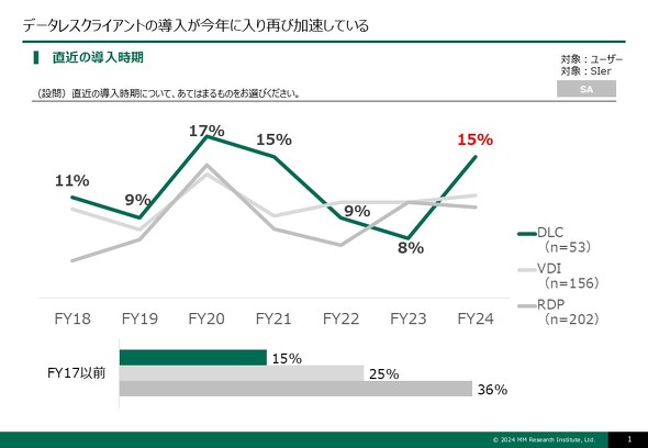 MM総研が6月に実施したDLCの市場調査によると、現在、日本では中小中堅企業で約2500万台、大企業で約1000万台の計3500万台のPCが稼働しているという。このうちデスクトップ環境を仮想化する技術「VDI」(仮想デスクトップインフラストラクチャ)を使っているのが290万台。DLCに対応したソフトの使用本数は、調査対象の8社で2022年度が約11万本、24年度が13万本(見込み)だった。その後は急激に増えるとみていて25年度は24万本、27年度は39万本が見込めると予測している。これに伴いソフトのライセンス販売金額は、24年度は約33億円(見込み)だが、27年度は96億円と3倍近い伸びを予測している。