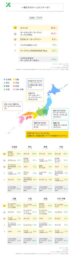 LINEヤフーは、全国の10〜60代を対象に「1番好きなホームセンター」に関する調査を実施した。全国1位は「カインズ」(20.8%)だった。