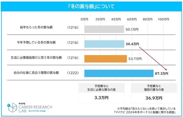 一方で「生活に必要最低限だと思う冬の賞与額」は平均53.7万円、「自分の仕事に見合う理想の賞与額」は平均87.3万円と、現実とのギャップが大きい。