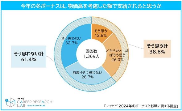 「物価高を考慮した額で支給されると思うか」について「そう思わない」と回答した人は32.7%、「あまりそう思わない」は28.7%と、合計すると6割以上が賞与額に物価高が考慮されていないと考えていることが分かった。